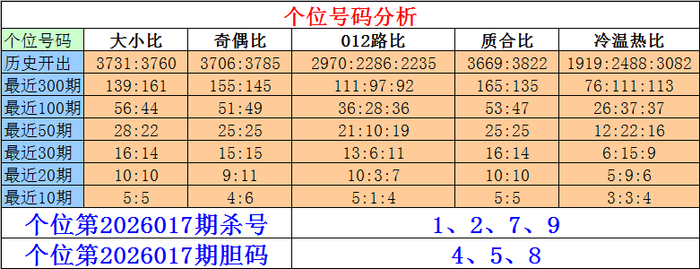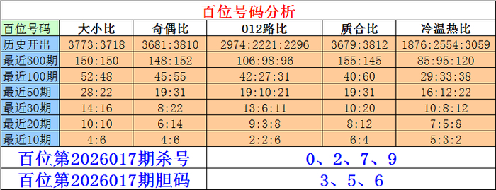 排列三百位第2026017期杀号:0、2、7、9