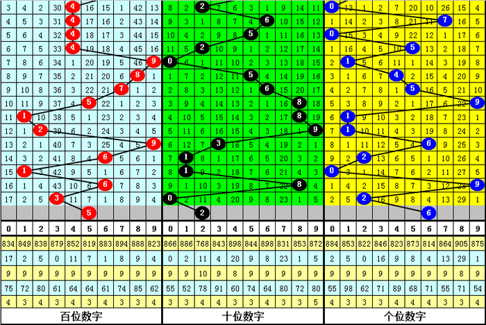 一、不才期开奖中,百位号码奇偶比为2:5,大小比为3:4,012路比为3:3:1,本期百位在意号码:5、7、9,胆码在意2路号码:5。