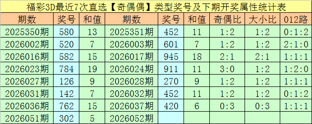 开奖转头:福彩3D第2026051期开奖号码为302,奖号直选类型为:奇偶偶、小小小和002路。
