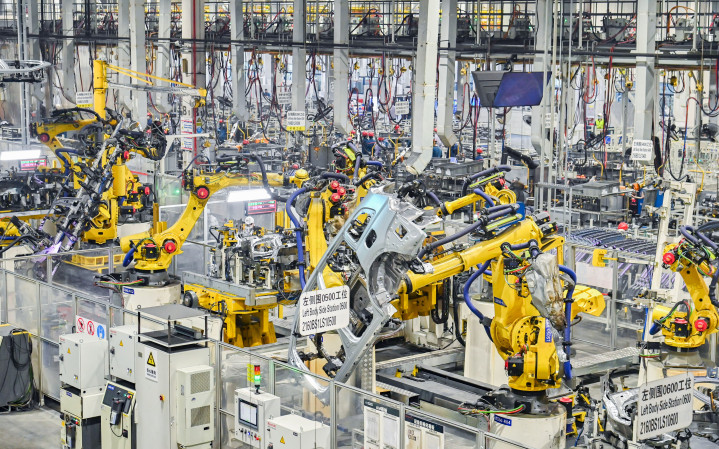 2024年11月,重庆市沙坪坝区某品牌汽车工厂内,自动化机械手臂正在完成焊接等工作。图/ICphoto