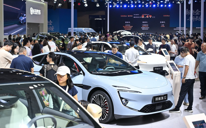 2025年9月,世界智能产业博览会在重庆举办,多款智能网联新能源汽车集中展出,吸引众多参观者。图/ICphoto