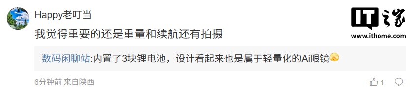 博主还称,这款眼镜内置了 3 块锂电池,设计看起来也是属于轻量化的 AI 眼镜。